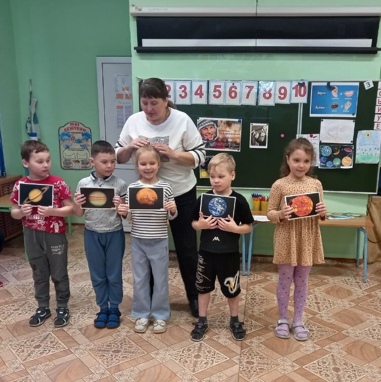 Библиотекарь вместе с ребятами рассматривали иллюстрации звездного неба, солнца и планет. Поиграли в подвижные игры «Ждут нас быстрые ракеты», «Космическая фигура». Считали планеты и отгадывали загадки о них.