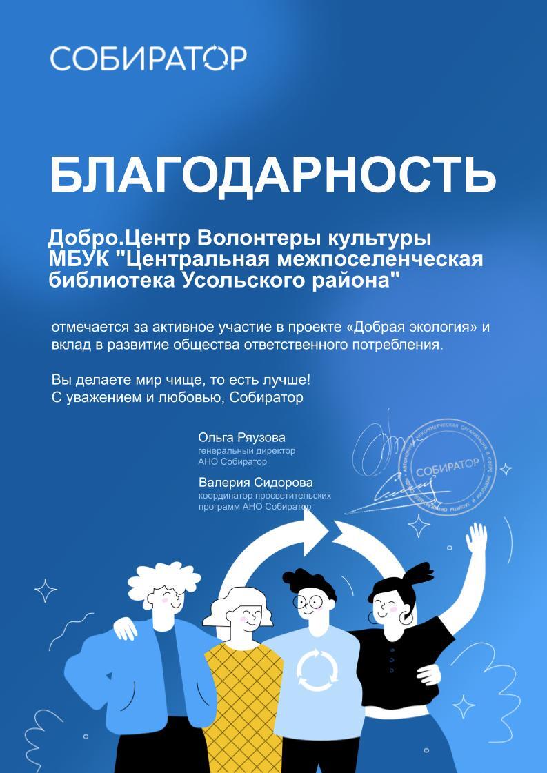 Получили благодарность от генерального директора АНО "Собиратор" за активное участие во Всероссийском проекте "Добрая экология".