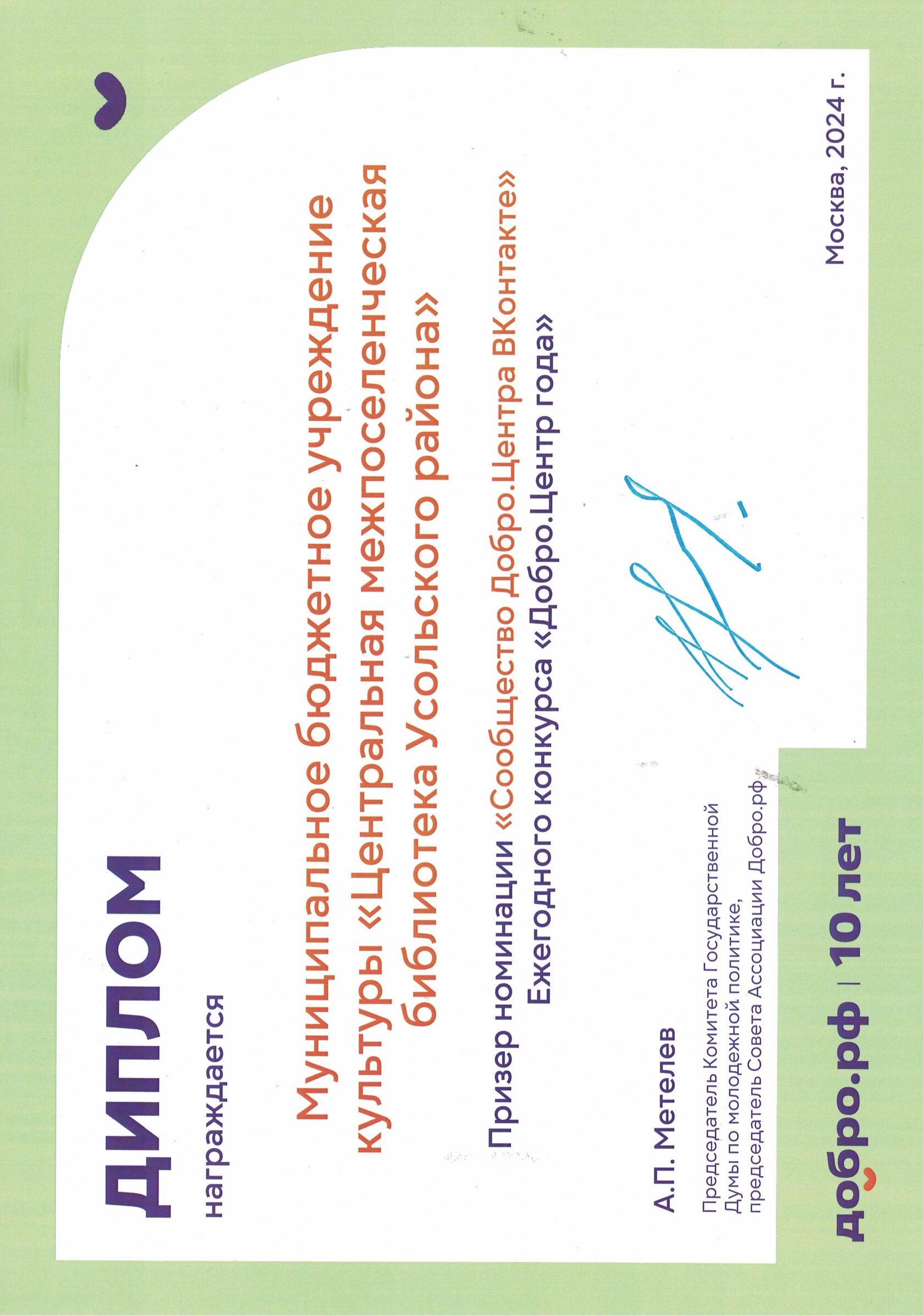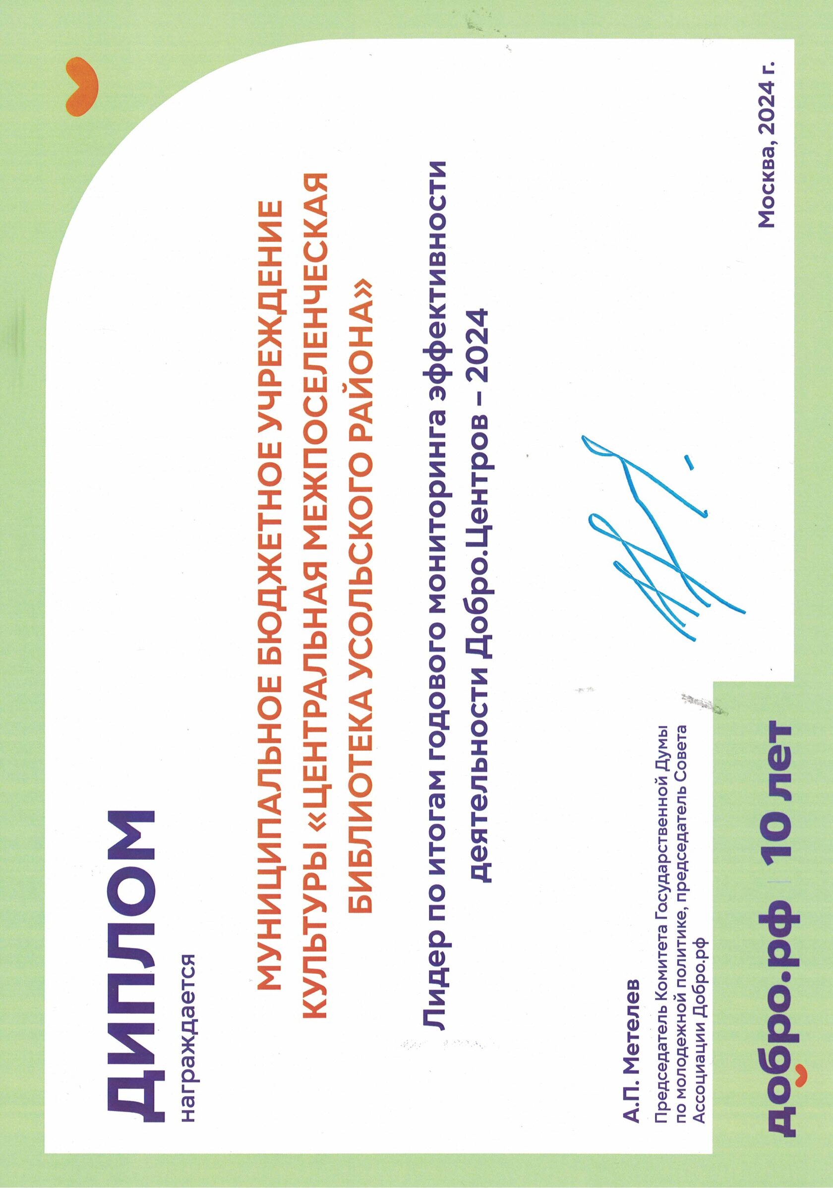 Вошли в ТОП-150 лидеров по итогам мониторинга эффективности деятельности Добро.центров - 2024. За это достижение центр был награжден дипломом и планшетом.